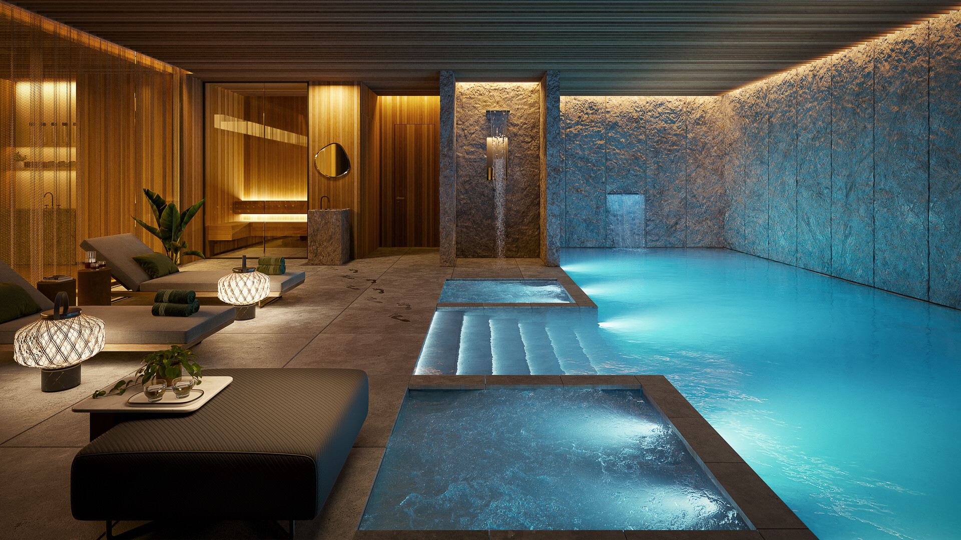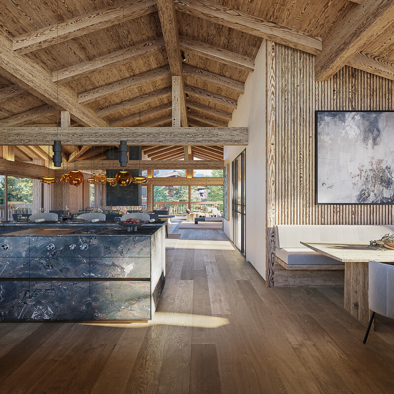 Das Herzstück des Chalets bildet der weitläufige Wohn-, Koch- und Essbereich, der mit einer eleganten, maßgefertigten Küche und hochwertigen Materialien beeindruckt. Bodentiefe Fenster schaffen ein lichtdurchflutetes Ambiente und eröffnen einen atemberaubenden Blick auf die Kitzbüheler Bergwelt. Das Anwesen bietet insgesamt fünf Schlafzimmer und sieben Bäder, die Privatsphäre und Komfort auf höchstem Niveau garantieren.