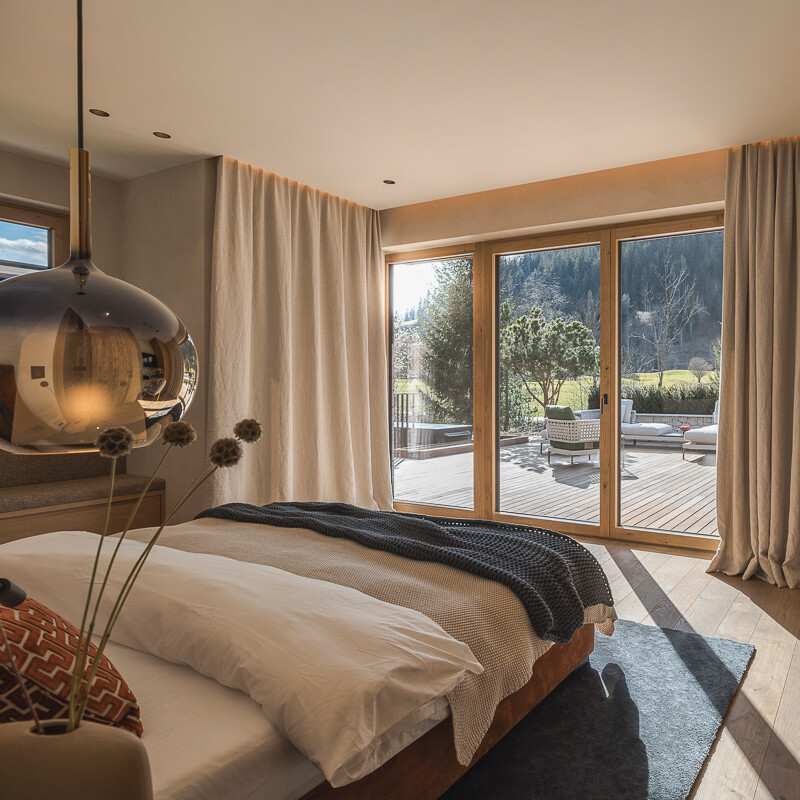 Der einladende Wohn-, Koch- und Essbereich vermittelt mit seinem offenen Konzept eine angenehme Weite. Ein charaktervoller Kamin, kombiniert mit einem maßgefertigten und in die Wand eingelassenem Bücherregal, sorgt für eine behagliche Atmosphäre und lädt zu entspannten Stunden ein. Der gemütliche Windowseat wird zum Lieblingsplatz, um die beeindruckende Bergkulisse zu genießen, während sich von der hochwertig ausgestatteten Küche aus ein freier Blick auf das imposante Kaisergebirge eröffnet. Die großzügige Terrasse mit duftendem Kräuterbeet bietet einen direkten Übergang in die Natur und eröffnet malerische Ausblicke auf die Ache sowie den Golfplatz, der sich im Winter in eine idyllische Langlaufloipe verwandelt.